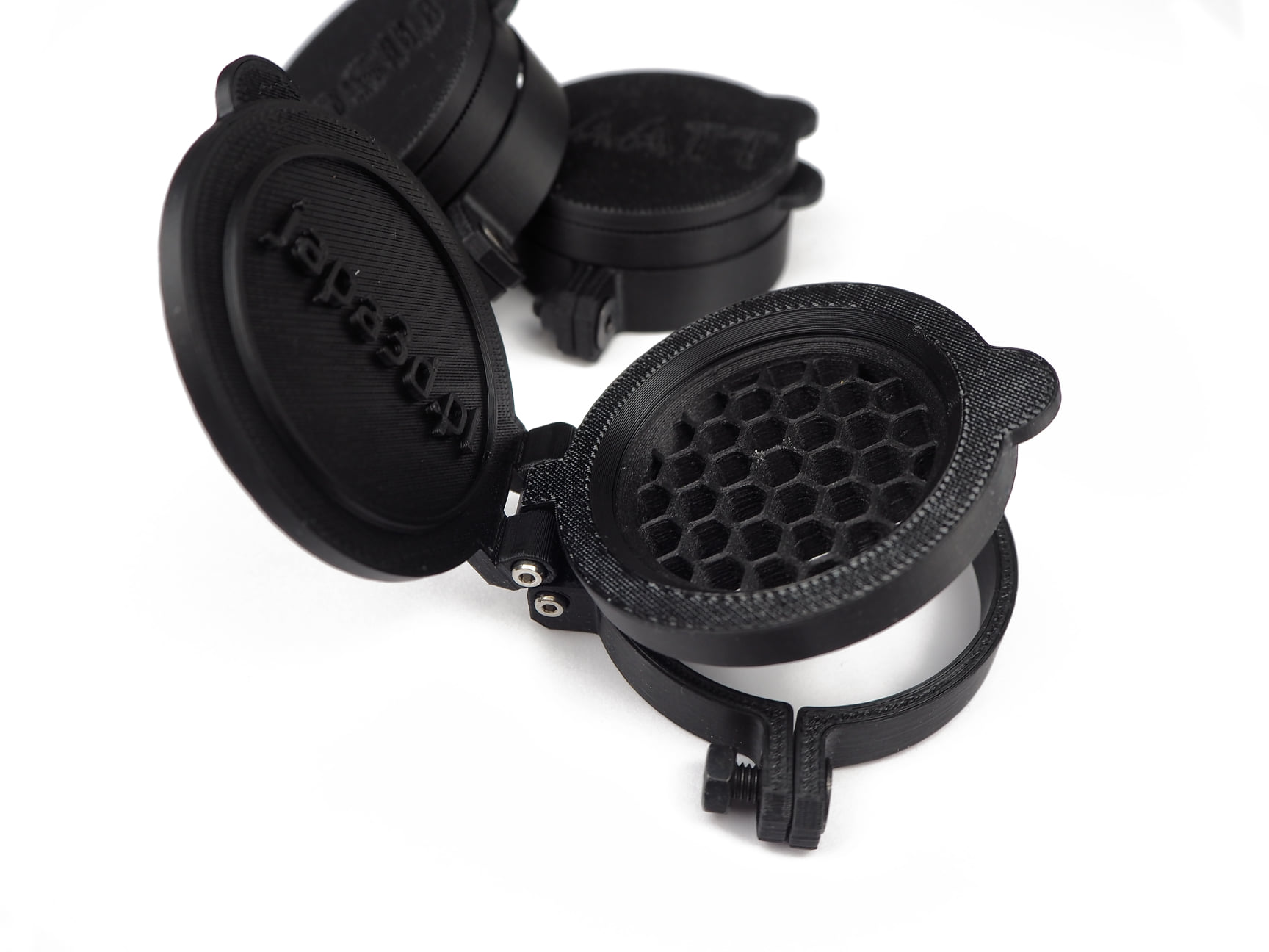 Do wydruku osłony soczewki wykorzystano najmocniejszy ogólnodostępny materiał w technologii druku FDM czyli nylon z włóknem węglowym (15%) PA12CF15. Kształt otworów osłony dobrano na wzór plastra miodu ponieważ posiada najmniejszy współczynnik przykrycia obrazu. Minimalna możliwa do uzyskania grubość ścianki to 0,5 mm czyli jedna ścieżka wydruku dyszy o średnicy 0,4 [mm].