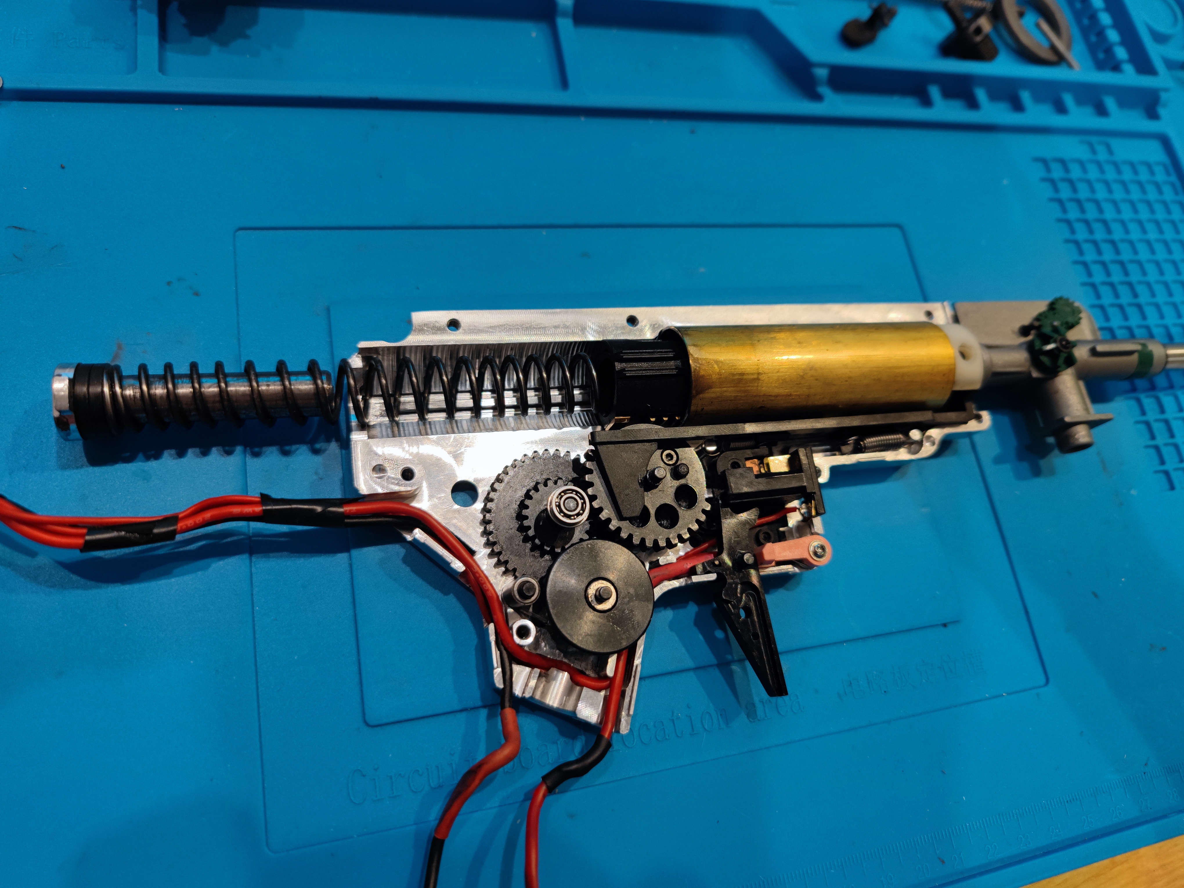 Wymieniono praktycznie wszystkie części mechaniczne i pneumatyczne wewnątrz przekładni poza zestawem cylindra. Z ważniejszych: stalowe wzmocnione zębatki 18:1, silnik neodymowy Guarder ITU, tłok z zębami powleczonymi azotkiem tytanu.
